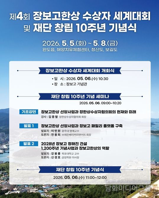 시민행정신문 강갑수 기자 | 사단법인 장보고글로벌재단(이사장 김덕룡)이 창립 10주년 기념식 및 제4회 장보고한상 수상자 세계대회를 5월 5일부터 8일까지 완도에서 개최한다고 밝혔다.