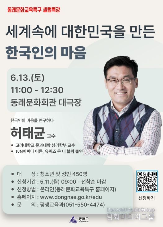 시민행정신문 강갑수 기자 | 부산 동래구는 오는 6월 13일 동래문화회관 대극장에서 세계 속의 대한민국을 만든 한국인의 마음’이라는 주제로 고려대학교 심리학부 허태균 교수의 특강을 개최한다고 밝혔다.