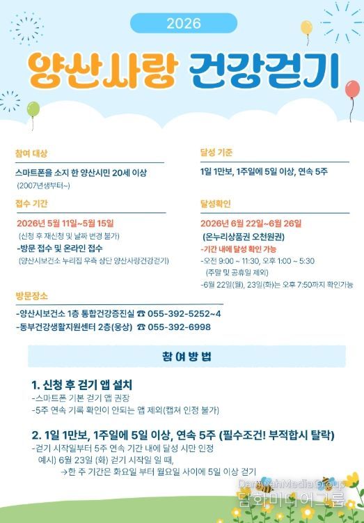 시민행정신문 기자 | 양산시는 시민들의 신체활동 증진과 건강한 생활습관 형성을 위해 ‘양산사랑 건강걷기’사업의 2차 접수를 5월 11일부터 5월 15일까지 진행한다고 밝혔다.