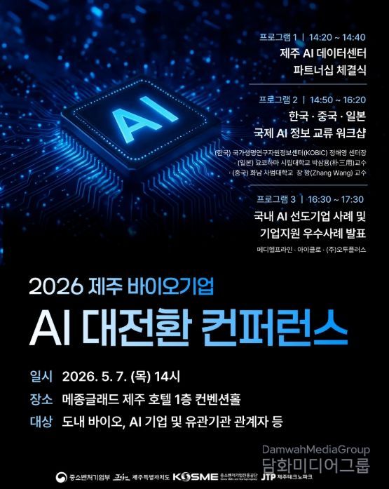 시민행정신문 이존영 기자 | 제주테크노파크(원장 지영흔, 제주TP)는 오는 5월 7일 오후 2시 메종글래드 제주 호텔에서 도내외 바이오 및 AI 산업 관계자 100여 명을 대상으로 ‘제주 바이오기업 AI 대전환(DX) 컨퍼런스’를 개최한다고 30일 밝혔다.