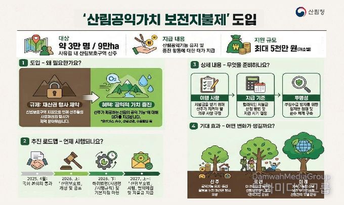 박영환 산림청 산림환경보호과장은 “이번 ‘산림보전지불제’ 도입을 계기로 국가와 산주가 함께 산림의 다양한 공익적 가치를 유지․증진시켜 국민의 삶의 질을 향상시키고 기후변화에 적극 대응할 수 있는 산림보호 정책 제도로 정착되기를 바란다.”고 말했다.