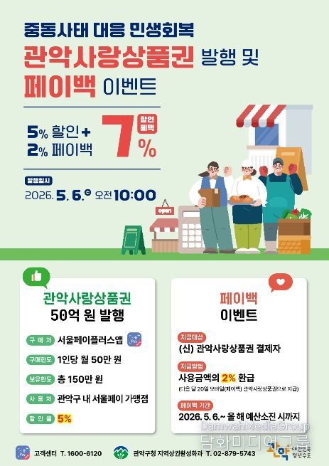 구는 오는 5월 6일 오전 10시부터 50억 원 규모의 관악사랑상품권을 발행한다. 이는 하반기에 발행 예정인 상품권 중 일부를 조기 발행한 것으로, 구 관계자는 “국가적 차원의 경제 위기 대응이 이루어지는 특수한 상황인 만큼, 정부 정책 기조에 부합하는 민생 안정 대책의 일환”이라고 설명했다.