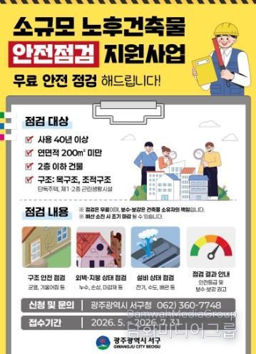 김이강 서구청장은 “안전관리 사각지대에 놓여 있던 소규모 노후 건축물까지 점검을 확대해 주민 불안을 해소하겠다”며 “선제적인 안전점검과 체계적인 사후관리를 통해 생활 속 안전사고를 예방하겠다”고 말했다.