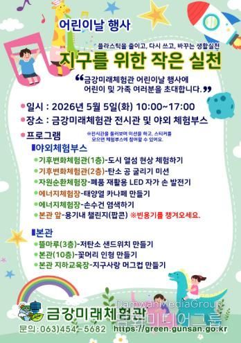 시민행정신문 강갑수 기자 | 군산시 금강미래체험관이 어린이날을 맞아 5월 5일 오전 10시부터 오후 5시까지 체험관 전시관과 야외 체험부스 일원에서 어린이 및 가족 단위 관람객을 대상으로 어린이날 기념 환경체험 프로그램 ‘지구를 위한 작은 실천’을 운영한다.