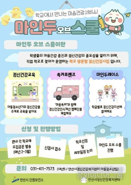 시민행정신문 기자 | 안산시 정신건강복지센터는 11월까지 관내 초·중·고등학교 총 10개교를 대상으로 학교로 찾아가는 정신건강사업 ‘마인두 오브 스쿨’을 운영한다고 30일 밝혔다.
