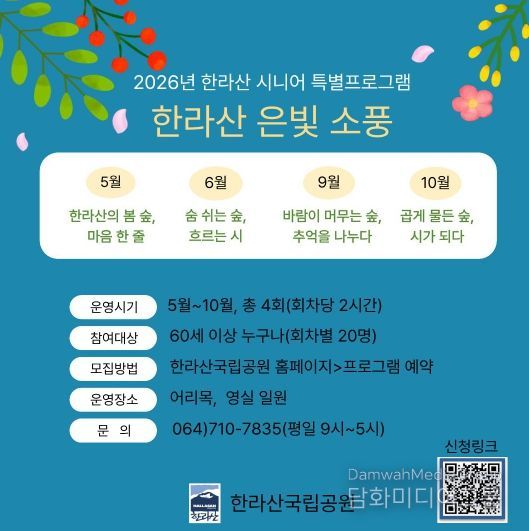 5월 프로그램 참가 신청은 한라산국립공원 누리집 ‘프로그램 예약'에서 4월 30일부터 5월 11일까지 회차별 20명씩 선착순으로 받는다.