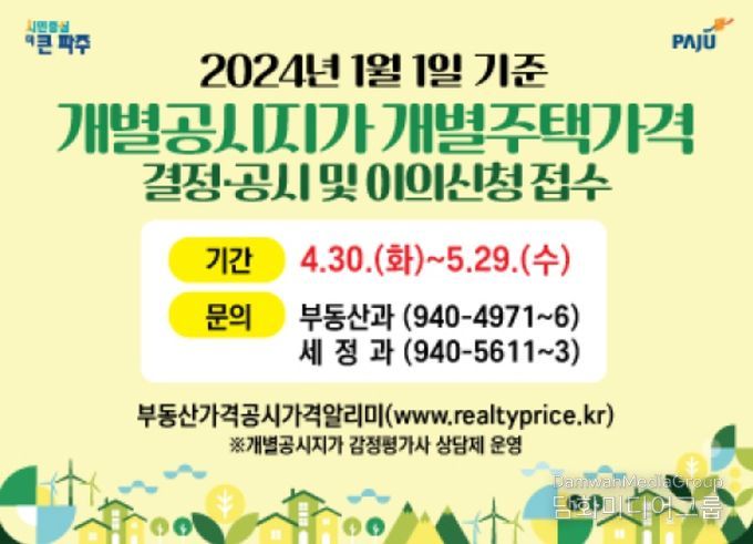 시민행정신문 이세훈 기자 | 파주시는 2024년 1월 1일 기준 개별주택가격을 4월 30일 결정·공시하고, 5월 29일까지 30일간 이의신청 기간을 운영한다고 밝혔다.