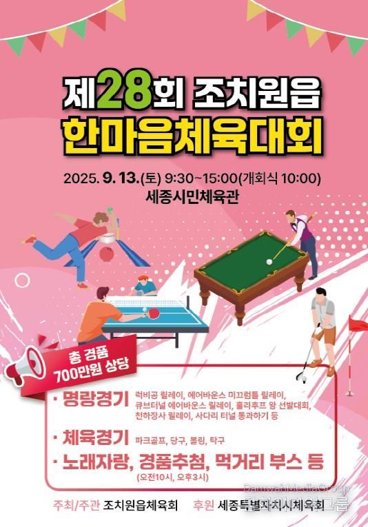시민행정신문 기자 | 세종특별자치시 조치원읍체육회가 오는 13일 조치원읍 세종시민체육관에서 ‘제28회 조치원읍 한마음 체육대회’를 개최한다.