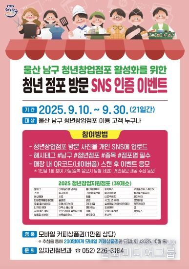 남구에 따르면 이번 이벤트는 9월 10일부터 9월 30일까지 진행되며 청년창업점포 방문인증 사진을 개인 사회관계망(SNS)에 올리고 매장 안에 비치된 큐알코드로 이벤트에 참여할 수 있다.