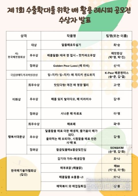 이번 공모전은 한국 배의 우수성을 알리고 다양한 배 활용 아이디어를 발굴하고자 7월 25일부터 8월 20일까지 진행했다. 이화여자대학교와 서대문구가 주최하고 국립원예특작과학원 배연구센터와 (사)한국배연합회가 주관했다.