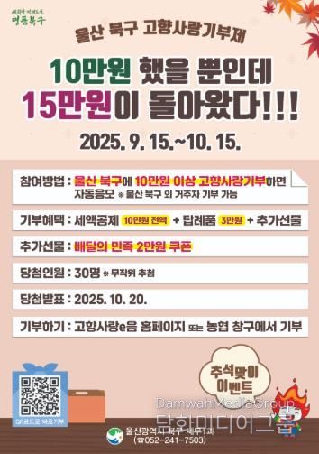 시민행정신문 강갑수 기자 | 울산 북구는 추석을 맞아 고향사랑기부제 이벤트를 실시한다고 16일 밝혔다.