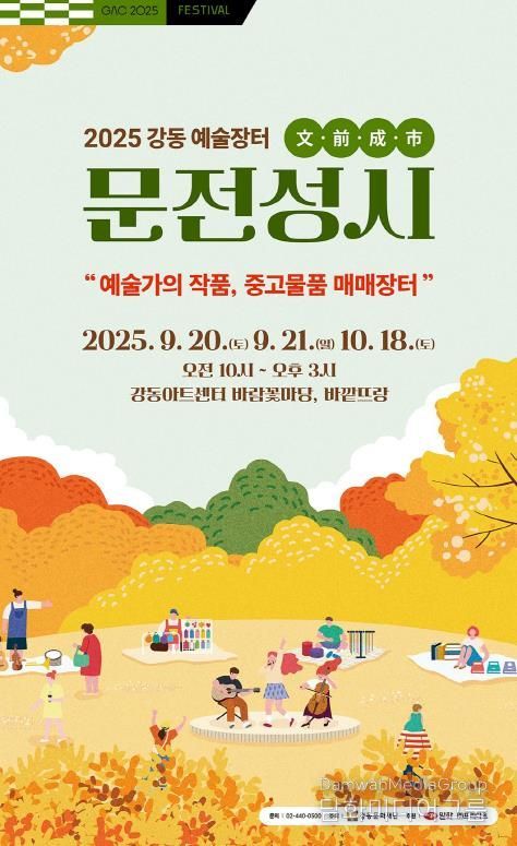 시민행정신문 이존영 기자 | 강동문화재단은 9월 20일과 21일, 강동예술장터 '문전성시(文前成市)'를 강동아트센터 앞 광장(바람꽃마당)과 옥상 정원(바깥뜨랑)에서 개최한다고 밝혔다. 60여 명의 지역 예술인이 참여해 작품 판매는 물론, 정원음악회·정원사진관·책 읽는 마당 등 다채로운 프로그램이 어우러지는 문화예술 축제로 펼쳐진다.