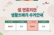 시민행정신문 김학영 기자 | 성주군은 설 명절을 맞아 귀성객과 주민들이 쾌적한 환경 속에서 명절을 보낼 수 있도록 2월 2일부터 2월 20일까지 '설 연휴 쓰레기 종합관리대책'을 추진한다. 군은 연휴 기간 귀성객과 군민의 생활 불편을 최소화하기 위해 연휴를 전·중·후로 구분한 대응체계를 마련한다. 연휴 전에는 주요거리 등의 쓰레기 중점 수거와 환경정비를 실시하고 음식물쓰레기 증가에 대비한 비상 수거용기를 비치한다. 연휴 중에는 특별상황반을 운영해 생활폐기물 처리와 민원에 대응하며, 읍·면의 상황반과 비상연락체계를 유지한다. 연휴 이후에는 마무리 대청소와 노면청소차 운영을 통해 깨끗한 환경 조성에 힘쓸 계획이다. 특히 명절 선물 포장 등으로 스티로폼 상자와 종이박스 배출이 증가할 것으로 예상됨에 따라, 관내 유통업소에서 판매되는 설 선물류의 과대포장 및 재포장 행위에 대해서도 점검을 실시한다. 또한 주민들에게 배출장소 내 무분별한 투기를 예방하기 위한 지도·단속과 함께 재활용품 올바른 분리배출 방법에 대한 홍보를 강화할 예정이다. 자원순환사업소 관계자는 “설 명절 기간 생활폐기물 발생량이 급증할 것으로 예상된다”