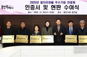 시민행정신문 이세훈 기자 | 용인특례시는 3일 본관 4층 전겹실에서 일자리 창출에 힘쓴 지역 우수기업 8곳에 인증서와 현판을 수여했다. 이번에 선정된 기업은 ▲아산디앤씨 주식회사 ▲일승푸드 제2공장 ▲주식회사 에이치에스씨 ▲㈜인실리코젠 ▲주식회사 홈체크 ▲㈜휴먼인텍 ▲케이제이건설산업(주) ▲트루션 등 총 8개사다. 시는 1차 서류심사와 2차 현장실사를 거쳐 일자리 창출 실적, 고용 안정성, 기업의 성장 가능성, 근로환경 등을 종합적으로 평가해 우수기업을 선정했다. 이들 기업은 최근 1년간 총 74명(기업당 4~19명)을 신규 채용해 지역 내 일자리 창출에 기여했다. 또, 다양한 직원복지제도로 근무하기 좋은 환경을 조성해 일자리의 질을 높이는 데 크게 힘쓴 것으로 평가됐다. 이들 기업에는 인증서와 현판이 수여되며, 시가 주최하는 일자리사업, 기업지원사업 참여 시 가점이 주어진다. 일자리박람회 등 채용 행사에도 우선적으로 참여할 수 있다. 용인특례시 일자리창출 우수기업 인증제는 2018년부터 시행되고 있으며, 매년 고용 확대와 일자리 창출에 기여한 기업을 발굴·지원하고 있다.