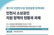 시민행정신문 이세훈 기자 | 인천연구원은 2026년 3월 9일 오후 3시 인천광역시사회적경제지원센터 세미나실에서 “인천시 소상공인 지원 정책의 현황과 과제”라는 주제로 '제11차 현장동행 정책대화'를 개최한다. 이 행사는 어려움 속에서 변화의 시기를 맞이하고 있는 인천시 소상공인의 현황을 점검하고 지원 정책의 방향성을 논의하기 위해 마련됐다. 첫 번째 발표는 인천연구원 유근식 연구위원이 “인천시 소상공인 생태계 현황 진단”을 주제로, 두 번째 발표는 인천소상공인종합지원센터 유지원 센터장이 “인천 소상공인 지원 사업 성과 분석 및 정책 제언”을 주제로, 세 번째 발표는 중소기업중앙회 김민석 차장이 “인천 소상공인의 은퇴‧폐업 준비 현황 및 폐업 애로사항”이라는 주제로 발표한다. 이어지는 종합토론에서는 인천소공인협회 오승섭 이사장, 인천소상공인연합회 지주현 사무처장 등으로 구성된 소상공인 대표자들과 인천광역시 소상공인정책과 이상은 과장 등을 비롯한 정책관계자 간의 토론이 진행될 예정이다. 이 행사는 정책의 수요자인 소상공인과 인천시, 인천연구원, 인천소상공인종합지원센터, 인천신용보증재단, 중소기업중앙