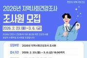시민행정신문 기자 | 천안시는 내달 6일까지 ‘2026년 지역사회건강조사’를 수행할 조사원을 모집한다고 23일 밝혔다. 지역사회건강조사는 질병관리청이 주관하는 국가승인통계로, 지역 주민의 흡연과 음주, 신체활동, 만성질환 이환 여부 등 건강행태 및 건강수준 전반을 조사하게 된다. 수집된 데이터는 지역 보건의료계획과 건강증진 사업 추진을 위한 기초 자료로 활용된다. 선발된 조사원은 사전 교육을 이수한 후 오는 5월 16일~ 7월 31일 표본 가구를 직접 방문해 조사 업무를 수행하게 되며, 업무가 완료되면 소정의 수당이 지급될 예정이다. 모집인원은 서북구와 동남구 각 6명씩 총 12명이며, 천안시에 거주하는 20세 이상 성인 중 컴퓨터와 인터넷 사용이 가능한 누구나 지원할 수 있다. 참여 신청은 천안시 서북구보건소 건강관리팀으로 방문하거나 우편으로 신청서를 제출하면 된다. 이현기 서북구보건소장은 “시의 내실있는 지역 건강통계 산출을 위해 책임감 있게 활동할 시민분들의 많은 참여와 관심 바란다”고 말했다.