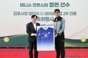 시민행정신문 장규호 기자 | 김포시는 17일 솔터실내테니스장에서 대한민국 테니스 스타 정현 선수의 김포시청 직장운동경기부 테니스팀 입단을 기념하고, 데이비스컵 2라운드 진출을 축하하는 행사를 개최했다. 이날 행사에는 김병수 김포시장을 비롯해 임청수 김포시체육회장, 박헌규 김포시테니스협회장과 테니스 관계자 및 동호인 등이 참석해 자리를 빛냈다. 행사는 시민과 동호인을 대상으로 한 팬 사인회를 시작으로 정현 선수의 주요 활약상을 담은 영상 상영, 기념 퍼포먼스, 입단 소감 및 축사 순으로 진행됐다. 특히 이날 행사에서는 정현 선수가 최근 데이비스컵 경기에서 실제 착용한 유니폼을 기념 액자로 제작해 김병수 시장에게 전달하는 의미 있는 시간이 마련됐다. 해당 유니폼은 국가대표 경기 특성상 소속팀 마크를 부착할 수 없음에도 불구하고, 정현 선수가 김포시청 입단을 기념하고 김포시를 알리기 위해 대한테니스협회에 요청해 특별히 김포시청 마크를 부착하고 출전한 것으로 알려져 의미를 더했다. 이어 김병수 시장은 정현 선수에게 꽃다발을 전달하고, 정현 선수의 유니폼에 김포시청 마크를 부착하는 퍼포먼스를 통해 김포시청