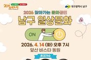 시민행정신문 기자 | 대구 남구는 지역 주민들에게 일상 속 문화 향유 기회를 확대하고, 지역 예술가들의 공연 활동을 지원하기 위해 ‘2026 찾아가는 문화공연’ 을 개최한다. 관내 신규 입주 공동주택을 대상으로 공연을 희망하는 아파트 단지를 선정하였으며, 오는 4월 14일(화) 앞산비스타동원 아파트에서 첫 공연을 진행할 예정이다. 저녁 7시에 열리는 ‘앞산비스타동원 음악회’에서는 인기 개그맨 김재롱이 사회를 맡고, 지역 가수 이새벽과 미스트롯 4 출연자 장혜리 가수가 공연을 펼친다. 또한, 아파트 입주 후 처음으로 열리는 주민 참여 행사인만큼 입주자 대표회에서도 다양한 경품과 선물을 준비하여 주민 화합의 장을 만들 예정이다. 조재구 남구청장은 “대규모 축제나 행사도 중요하지만, 주민들이 사는 가까운 동네에서 편하게 문화예술을 접할 수 있도록 찾아가는 문화행정을 적극 추진하겠다.”라며, “아파트로 찾아가는 음악회를 통해 주민들이 일상에서 소소한 행복을 느끼며 힐링할 수 있기를 바란다.”라고 전했다. ‘찾아가는 문화공연’에 대한 문의는 남구 문화관광과 문화예술팀으로 연락하면 안내받을 수 있다.