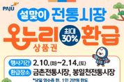 시민행정신문 강갑수 기자 | 파주시는 2026년 설 명절을 맞아 고물가로 인한 시민들의 가계 부담을 덜고 지역 전통시장 활성화를 도모하기 위해 ‘설맞이 농축산물 온누리상품권 환급 행사’를 실시한다. 이번 행사는 농림축산식품부가 주관하는 ‘농축산물 할인지원’사업의 일환으로, 본격적인 제수용품 구매 기간인ق월 10일부터 14일까지 5일간 관내 전통시장 2곳(봉일천전통시장, 금촌전통시장)에서 진행된다. 행사 기간 동안 참여 점포에서 국산 농축산물을 구매한 고객은 구매 금액에 따라 1만 원 또는 2만 원 상당의 온누리상품권을 환급받을 수 있다. 환급 기준은 ▲구매 금액이 3만 4천원 이상 6만 7천 원 미만일 경우 1만 원 ▲6만 7천 원 이상일 경우 2만 원이며, 환급 한도는 1인당 최대 2만 원이다. 단, 예산 소진 시 행사는 조기 종료될 수 있다. 환급을 희망하는 고객은 당일 구매 영수증과 신분증을 지참해 각 시장 내에 마련된 지정 환급처를 방문하면 된다. 환급 대상 품목은 국산 농산물 및 축산물이며, 수입산 농축산물이나 법인카드 결제 내역, 제로페이 모바일 상품권 결제 내역 등은 환급 대상에서 제외