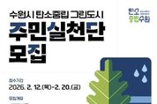 시민행정신문 강갑수 기자 | 수원특례시가 ‘생활 속 탄소중립 실천’을 확산하기 위해 2월 12일부터 20일까지 탄소중립 그린도시 사업 대상지 주민·생활권자를 대상으로 ‘수원시 탄소중립 그린도시 주민실천단’ 신규 참여자를 모집한다. 주민실천단은 탄소중립 그린도시 사업 대상지 주민과 생활권자로 구성된 시민 참여 조직이다. 지역 내 탄소중립 실천 활동과 홍보, 주민 참여 활동 등을 한다. 특히 수원시는 올해 주민실천단을 70명 규모로 확대 운영할 계획이다. 지난해 운영 성과를 바탕으로 신규 참여자를 모집해 참여 기반을 넓히고, 일회성 캠페인을 넘어 생활 속 실천이 자연스럽게 이어지는 탄소중립 문화를 확산할 계획이다. 모집 대상은 고색동·오목천동·탑동·서둔동·호매실동·평동·평리동 일부 등 탄소중립 그린도시 사업 대상지 거주민과 해당 지역 생활권자다. 주민실천단은 자원봉사 형태로 활동하며 ▲생활 속 탄소 저감 실천 ▲지역 맞춤형 실천 활동 ▲탄소중립 실천 홍보 ▲분과 활동, 회의 ▲역량 강화 교육 등에 참여한다. 수원시는 탄소중립 그린도시 주민실천단 확대 운영에 맞춰 참여자 역량을 높이는 교육과