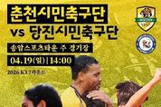 시민행정신문 장규호 기자 | 춘천시민축구단이 오는 19일 홈경기 3연승에 도전한다. 춘천시민축구단은 19일 오후 2시 송암스포츠타운 주경기장에서 당진시민축구단을 상대로 2026 K3리그 홈경기를 치른다. 이번 경기는 홈 3연승 달성과 함께 리그 상위권 진입을 위한 중요한 분수령이 될 전망이다. 특히 이번 경기는 4월 20일 ‘장애인의 날’을 기념해 다양한 체험 프로그램이 함께 운영된다. 경기장 일대에서는 장애인체육 종목인 한궁, 슐런, 휠체어 체험 등이 마련돼 시민 누구나 참여할 수 있으며 에스코트 키즈 역시 명진학교 학생들이 함께해 의미를 더할 예정이다. 경기 당일에는 선수단 팬사인회를 비롯해 푸드트럭 운영, 선수 사생대회 등 다양한 참여형 이벤트도 함께 열려 경기장을 찾은 시민들에게 즐거움을 제공할 계획이다. 또한 최근 기온이 상승함에 따라 관람객 편의와 안전을 고려해 관람 구역을 기존 가변석이 아닌 그늘이 확보된 W석 중심으로 운영할 예정이다. 치어리더와 함께하는 응원전도 펼쳐져 현장 분위기를 더욱 뜨겁게 달굴 것으로 기대된다. 춘천시는 홈