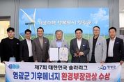 시민행정신문 강갑수 기자 | 영광군은 11월 5일 경기 화성시 정조효공원 야외무대에서 열린 ‘제7회 대한민국 솔라리그(K-Solar League) 시상식’에서 기후에너지환경부장관상을 수상했다고 10일 밝혔다. ‘대한민국 솔라리그’는 기후위기대응·에너지전환지방정부협의회, 전국지속가능발전협의회, 한국에너지공단, 한국태양광산업협회, 한국태양광공사협회, 한국RE100협의체가 공동으로 주최해 재생에너지 보급 확대와 탄소중립 실현에 기여한 우수 지자체, 공공기관, 민간 업·단체를 발굴하고 포상하는 전국 규모 대회로 올해 7회째를 맞는다. 이번 수상에서 영광군은 △재생에너지 자립률 104% 달성 △군민 참여와 개발이익 공유 조례 제정과 발전 이익을 군민 기본소득으로 지급하는 공유화 기금 조례 제정 △주민주도형 ‘재생에너지 발전 주민참여제도’를 활성화를 위한 읍면별 주민설명회를 여러 차례 개최하여 주민 의견을 폭넓게 수렴한 점 등 혁신적인 정책 추진 노력을 높게 평가받았다. 특히, 염산면 월평마을의 3MW급 전국 최대 규모 주민 주도 영농형 태양광 발전단지는 주민이 56% 지분을 소유하여 마을 28가구에 발전 수익을 배분하는