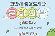 시민행정신문 강갑수 기자 | 천안시 쌍용도서관은 매달 마지막주 수요일 ‘2026 문화가 있는 날’ 행사를 운영한다고 16일 밝혔다. 쌍용도서관은 올해 문화가 있는 날에 1인당 20권의 책을 빌릴 수 있는 ‘2배로 Day’와 블라인드 도서 대출 행사 ‘오늘 뭐 읽지?’를 운영한다. 자세한 사항은 쌍용도서관으로 문의하면 된다. 쌍용도서관 관계자는 “문화가 있는 날 행사를 통해 시민들이 독서에 관심을 갖게 되는 계기가 되길 바란다”며 “도서관 이용의 활성화를 기대한다”고 말했다.