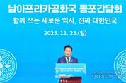 시민행정신문 이존영 기자 | 주요 20개국(G20) 정상회의 참석을 위해 남아프리카공화국을 방문한 이재명 대통령은 23일(현지시간) 양국 수교 후 최초로 동포간담회를 개최해 현지에 거주하는 동포들을 격려했다. 이번 간담회에는 동포단체 대표, 경제인, 민주평통 자문위원, 한글학교 관계자, 문화예술인 등 약 70명이 참석했다. 동포 대표로 나선 전소영 남아공 한인회장은 환영사에서 "한국과 남아공은 오랜 세월 우정과 신뢰를 쌓아온 파트너인 만큼, 대통령님의 이번 방문이 양국 관계를 굳건히 다지는 계기가 되기를 기대한다"는 소망을 전했다. 이 대통령은 격려사를 통해 "모국에서 약 1만 2000km인 삼만 리나 떨어진 남아공에서도 동포들이 주권 행사에 어려움이 없도록 전자투표 도입 등 재외선거제도 개선에 노력하겠다"라고 말했다. 또한, "재외동포 현황을 면밀히 파악하고 동포들의 활동을 본국이 적극 지원해 대한민국 국민으로서 소외되지 않고 자부심을 가질 수 있도록 최선을 다하겠다"고 격려했다. 이어 이동민 민주평통자문회의 아프리카협의회 중남부지회장의 건배사로 본격적인 오찬이 시작됐다. 이 대통령은 동포들의 다양한 목소리를 경청하기 위해 진솔한 이야기를 들려달라고 독려했