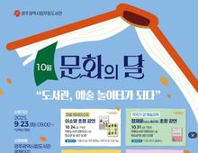 시민행정신문 기자 | 광주광역시립도서관(무등·사직·산수)은 ‘10월 문화의 달’을 맞아 가족들이 도서관에서 함께 즐길 수 있는 강연, 전시, 체험 프로그램 등 ‘도서관, 예술 놀이터가 되다’ 행사를 운영한다. 무등도서관은 10월 한달 간 가을·책 주제 ‘민화 단체전’과 자료실 테마도서 전시를 연다. 오는 24일 아트컬렉터 이소영(미술 에세이스트)의 ‘현대미술 클로즈업!’, 31일 예술감독 정재윤(aka 쥴리정)의 ‘문학 속 음악의 장면들’, 19일과 29일에는 ‘제로웨이스트 특강’으로 친환경 비누 만들기와 캘리그라피 텀블러 만들기 체험 행사를 운영한다. 사직도서관은 10월 한달 동안 전통문화 ‘조선 화원의 하루’ 원화 전시, 자료실 테마도서 전시를 진행한다. 이와 함께 22일 이승연 작가의 ‘케이(K) 콘텐츠의 중심 한국 영화를 말하다’, 25일 ‘나만의 보자기 가방 만들기’ 전통문화 체험프로그램을 준비했다. 산수도서관은 13일부터 24일까지 ‘엄마는 좋다’ 그림책 원화 전시와 연체자 해방의 날 행사를 운영하고, 16일에는 빛과 무늬로 완성하는 자개거울 체험을, 23일에는 실용과 멋을 담은 냄비받침 체험을 할