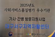 시민행정신문 강갑수 기자 | 대구 서구지역자활센터는 보건복지부 주관 2025년 가사·간병 방문지원사업 품질 평가에서 전국 349개소 중 상위 9개소에 해당하는‘우수 기관’으로 선정됐다. 이번 평가는 ▲기관 운영 ▲제공 인력 및 인적자원관리 ▲서비스 제공 및 평가 ▲서비스 성과 ▲현장 평가단 등 5개 영역에서 실시됐으며, 서구지역자활센터는 전 영역에서 90점 이상의 높은 점수를 획득하며 탁월한 운영 역량을 입증했다. 우수 기관으로 선정된 서구지역자활센터는 포상금과 함께 보건복지부 장관 상장, 우수 기관 현판을 수여받는 영예를 안았다. 이는 지역사회 내 돌봄서비스의 질적 향상과 지속 가능한 가사간병방문지원사업 운영에 큰 동력을 제공할 것으로 기대된다. 류한국 서구청장은 “앞으로도 가사·간병 방문 지원 서비스 대상자에게 질 높은 서비스를 제공하고, 제공 인력인 요양보호사들에게 건강하고 내실 있는 일자리를 제공할 수 있도록 서구지역자활센터를 지속적으로 지원하겠다.”라고 밝혔다.