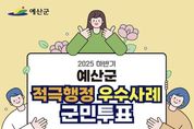 시민행정신문 강갑수 기자 | 예산군은 2025년 하반기 적극행정 우수공무원 선발을 위해 4월 1일부터 7일까지 7일간 온라인 군민투표를 실시한다고 밝혔다. 군은 적극적인 업무 추진으로 공공의 이익 증진에 기여하고 공직사회에 적극행정 문화를 확산하기 위해 매년 상하반기 적극행정 우수공무원 선발을 추진하고 있다. 군민투표는 1차 내부 실무평가단 심사를 통과한 적극행정 사례 18건 중 2건에 투표하는 방식으로 진행되며, 정보무늬(QR코드) 접속 또는 군 누리집 ‘군민참여-설문조사’ 코너에서 본인인증 후 참여할 수 있다. 군은 실무심사와 군민투표, 적극행정위원회 심사 점수를 합산해 4월 중 적극행정 우수공무원을 선발하고 인사상 우대 조치와 함께 포상금을 지급할 계획이다. 군 관계자는 “현장의 다양한 목소리를 정책에 반영하고 적극행정을 더욱 활성화하기 위해 우수공무원 선발에 많은 관심과 참여를 부탁드린다”고 당부했다.