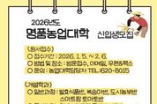 시민행정신문 강갑수 기자 | 남원명품농업대학은 2026학년도 신입생 120명을 선발한다고 밝혔다. 이번 신입생 모집은 2026년 1월 5일부터 2월 6일까지 약 한달간 모집 예정이다. 일반과정 4개과 발효식품, 복숭아, 도시농부, 스마트팜 토마토반을 운영하며 학생들의 전문적인 교육을 위해 특별과정으로 청년 스마트팜 특별반 기초 과정과 심화 과정으로 분류하여 2개과를 전공별 모집 시스템을 전격 도입하여 전문성을 강화한 것이 특징이다. 올해 2026년 남원명품농업대학에서는 일반과정 4개과에서 각 25명씩, 특별과정 각 10명씩 모집하여 실습 중심 교육이 될 수 있도록 할 예정이며 특히 청년 스마트팜 특별반 모집에는 수준별 맞춤형 농업교육으로 남원의 우수한 청년 인재들이 농업의 경쟁력 강화와 지속 가능한 스마트 농업 분야에 진출할 수 있도록 교육에 중점을 둘 계획이다. 모집원서 접수는 각 읍면동 농민상담소나 남원시농업기술센터 농촌진흥과 인력육성팀접수 받고 있다.