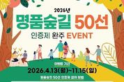 시민행정신문 강갑수 기자 | 산림청은 숲길을 활용한 국민의 여가 활성화 및 지역경제 활성화를 위해 ‘2026년 명품숲길 50선 완주 인증제’를 11월 15일까지 운영한다고 13일 밝혔다. ‘명품숲길 50선 완주 인증제’는 2025년 첫 도입 이후 국민의 높은 관심과 참여로 총 23명의 완주자를 기록했으며, 올해는 2년 차를 맞아 참여 기회를 확대하고 이용 편의성을 개선했다. 이번 인증제는 스마트폰 앱 ‘모바일 스탬프 투어’를 활용한 GPS기반 온라인 인증과 숲길 현장 스탬프를 활용한 오프라인 인증 방식을 병행해 누구나 쉽게 참여할 수 있도록 운영한다. 참여자가 50개소를 모두 완주하면 앱을 통해 전자 인증서가 자동으로 발급되며, 실물 인증서는 모바일 앱을 통해 별도로 신청할 수 있다. 전국 50개 명품숲길을 모두 완주할 경우 산림청장 명의의 완주 인증서와 기념품이 제공된다. 앱 설치 방법 등 인증제에 대한 자세한 사항은 산림청과 숲나들e 누리집을 통해 확인할 수 있다. 조영희 산림청 산림복지국장은 “명품숲길 완주 인증제는 국민이 숲길을 보다 적극적으로 경험하고 가까워지는 계기이다.”며,