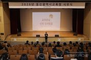 시민행정신문 기자 | 울산광역시교육청은 5일 오전 10시 시교육청 대강당에서 전 직원이 참석한 가운데 2026년 시무식을 겸한 1월 다모임 행사를 열고 새해 업무를 본격적으로 시작했다. 이날 행사는 새해를 맞아 울산 교육정책의 방향을 공유하고 직원 간 결속을 다지고자 마련됐다. 1월 1일 자 전입 직원 소개를 시작으로 모범·우수공무원 포상 전수식, 올해 울산교육 기본 방향 안내, ‘울산 아이코닉 치어리딩팀’의 문화 공연, 교육감 신년 인사 순으로 진행됐다. 천 교육감은 신년 인사말에서 “2026년은 ‘함께 성장하며 도약하는 울산교육’을 목표로 회복적 생활교육과 독서·토론 문화 확산, 수업 나눔으로 학교 현장을 변화시키고 아이들의 역량과 자신감을 키우는 한 해가 될 것”이라며 “학교 현장과 적극 소통해 정책이 충실히 반영되도록 하고, 아이들의 성장과 미래를 책임진다는 마음으로 울산교육청이 든든한 버팀목 역할을 해 나가겠다”라고 말했다. 울산교육청은 올해 4대 교육정책인 미래 준비 책임교육, 학생 맞춤 안심교육, 관계 중심 공감교육, 현장 지원 열린행정을 중점 추진한다. 평화롭고 따뜻한