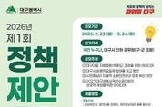 시민행정신문 강갑수 기자 | 대구광역시는 전 국민과 시 산하 공무원의 창의적인 정책 아이디어를 발굴해 시정 발전의 동력으로 활용하고자 ‘2026년 제1회 정책제안 공모’를 개최한다. 이번 공모는 총 4개 분야를 주제로 진행된다. ▲대구 대표 지방정원(하중도) 조성을 위한 아이디어 ▲ 대구시 승용차요일제 참여율 제고 방안 ▲시민 중심의 자발적 소방안전관리 문화 확산 방안 ▲2027 대구세계사격선수권대회의 성공 개최 방안이다. 공모 기간은 2월 23일부터 3월 24일까지 30일간이며, 대한민국 국민이라면 누구나 참여할 수 있다. 제안은 대구시 온라인 참여 플랫폼 ‘토크대구’, 국민신문고, 우편, 방문, 팩스 등을 통해 접수 가능하며, 자세한 사항은 대구시청 홈페이지 공고 게시판에서 확인하면 된다. 접수된 제안은 업무 담당부서에서 창의성과 실시 가능성 등을 기준으로 채택 여부를 사전 검토하고, 이후 제안실무위원회 심의를 거쳐 우수 제안 후보를 선정한다. 선정된 후보에 대해서는 5월 초 시민이 직접 참여하는 온라인 투표 점수(30%)와 전문가로 구성된 제안심사위원회 심사 점수(70%)를 합산