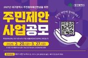 시민행정신문 강갑수 기자 | 대구광역시는 시민의 목소리를 시정에 직접 반영하기 위해 2월 20일부터 3월 27일까지 36일간 ‘2027년도 예산편성을 위한 주민제안사업’을 공모한다. 이번 공모 규모는 총 140억 원 규모로, 공모 분야는 ▲시정 참여형(70억 원) ▲구·군 참여형(40억 원) ▲읍·면·동 참여형(30억 원) 등 총 3개 부문으로 나뉜다. 대구 시민은 물론 대구 소재 직장인과 학생이라면 누구나 참여할 수 있다. 다만, 대구시와 구·군 공무원 및 산하 출연·투자기관에 종사하는 사람은 제외된다. 제안은 주민참여예산 누리집과 이메일, 팩스, 우편 및 방문 접수를 통해 가능하다. 대구시는 참여자 가운데 추첨을 통해 모바일 상품권을 지급하며, 향후 투표를 통해 우수사업으로 선정된 제안자에게는 대구광역시장 표창을 수여할 계획이다. 접수된 사업은 사업부서 검토와 주민참여예산위원회의 숙의·심사, 주민투표 및 총회 승인을 거쳐 선정되며, 시의회 예산심의·의결을 통해 2027년 주민참여예산 사업으로 최종 확정된다. 한편, 대구시는 지난해 주민제안사업 공모를 통해 ▲불로고분공