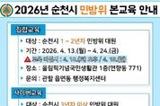 시민행정신문 강갑수 기자 | 순천시는 오는 13일부터 관내 민방위 대원의 비상사태 및 재난 발생 시 대응 역량 강화를 위해 ‘2026년 민방위 본교육’을 실시한다고 밝혔다. 이번 민방위 교육은 20세부터 40세(1986년생~2006년생)까지의 민방위로 편성된 15,064명을 대상으로 집합교육과 사이버교육으로 진행된다. 집합교육은 1~2년차 대원을 대상으로 4월 13일부터 24일까지 올림픽기념국민생활관(1층)에서 일 2회 진행되며, 전문 민방위 강사들이 ▲민방위 대원의 임무와 역할 ▲응급처치 방법 ▲화생방 공격 시 대응 방법 등을 교육한다. 또한, 주중에 교육 참여가 어려운 대원들의 편의를 위해 토요일인 18일 오전에도 집합교육을 실시하여 교육 참여율을 높이기로 했다. 사이버교육은 3년차 이상 대원을 대상으로 4월 13일부터 6월 30일까지 실시되며, 민방위 교육 사이트에 접속해 교육을 이수하면 된다. 시 관계자는 “최근 중동사태로 인해 안보 환경이 급변함에 따라 우리 일상을 지키는 민방위 교육의 중요성이 어느 때보다 강조되고 있다”며 “이번 교육을 통해 민방위 대원들의 비상시 대응 역