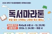 시민행정신문 강갑수 기자 | 대전 대덕구가 주민들의 독서 습관 형성을 돕기 위해 ‘2026 독서마라톤’을 운영한다. 구는 24일부터 대덕구 공공도서관(석봉·안산·송촌도서관)에서 독서마라톤 참가자를 선착순으로 모집한다고 밝혔다. ‘독서문화캠페인 대덕애서’의 일환으로 추진하는 이번 사업은 연중 목표를 설정해 완주까지 이어가는 관리형 프로그램이다. 특히 참여자가 스스로 독서 목표를 설정하고 독서노트 기록을 통해 완주까지 이어갈 수 있도록 도서관이 ‘독서 러닝메이트’ 역할을 수행한다. 프로그램은 개인과 단체로 나뉘어 운영된다. 개인 참여자는 △15권 ‘동춘당 코스’ △20권 ‘계족산 코스’ △25권 ‘대청댐 코스’ 중 하나를 선택할 수 있으며, 3~7인으로 구성된 단체는 △40권 ‘대덕애서 코스’에 참여할 수 있다. 참가자는 제공 받은 독서노트에 감상문, 감상평, 인상 깊은 문장 필사 등 자유 형식으로 독후활동을 작성한 후 완성된 독서노트를 촬영해 네이버 밴드(Booking~ 대덕구 도서관)에 게시하고 도서관에 제출하면 완주가 인정된다. 제출된 독서노트는 완주증 수여 시 반환되며,
