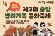 시민행정신문 이존영 기자 | 중랑구는 오는 11월 8일 토요일 오전 11시부터 용마폭포공원 다목적 광장에서 ‘제3회 중랑 반려가족 문화축제’를 개최한다. 중랑구가 주최하고 ㈜한국어질리티연합이 주관하는 이번 축제는 반려인과 비반려인 모두가 함께 즐기며 사람과 동물이 조화롭게 공존하는 문화를 조성하기 위해 마련됐다. 축제는 무대존, 플레이존, 부스존 등 3개 구역에서 다채로운 볼거리와 즐길 거리를 제공한다. 개회식은 오후 1시부터 류경기 중랑구청장 등 주요 내빈과 지역 주민 200여 명이 참석한 가운데 진행된다. 사전 공모된 ‘2025 중랑 유기동물 입양 사진·수기 공모전’ 시상식이 함께 열리며, 시상식 이후에는 반려견 능력시험과 더불어 행운권 추첨 등 다양한 프로그램이 진행돼 축제의 흥을 돋울 예정이다. 무대존에서는 중랑 K-댕댕이 헌터즈 펫션쇼와 같은 다양한 프로그램이 하루 종일 펼쳐진다. 플레이존은 반려 스포츠와 활동적인 체험 공간으로 구성된다. 펫티켓 5 미션게임, 어린이 훈련사 체험과 반려견 올림픽(기다려·이리와·찾아줘 대회)이 운영되며, 아시아 어질리티 챔피언십 한국 국가대표팀의 시범 공연을