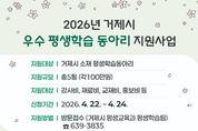 시민행정신문 강갑수 기자 | 거제시가 지역사회 학습공동체 형성과 배움문화를 조성하기 위해 '2026년 거제시 우수 평생학습 동아리 지원사업'을 실시한다. 지원대상은 관내 소재 평생학습동아리이며, 선정된 학습동아리 5개팀에 강사비, 교재·재료비, 홍보비 등 동아리 활동에 필요한 직접 운영 경비(100만원)를 지원한다. 신청방법은 공모신청서를 작성하여 거제시 평생교육과로 방문접수하면 되고, 접수기간은 4월 22일부터 4월 24일까지이다. 기타 자세한 사항은 거제시 평생학습관 홈페이지 공지사항 또는 거제시 평생교육과 평생학습팀으로 문의하면 된다.
