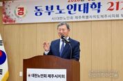 시민행정신문 강갑수 기자 | 김완근 제주시장은 2월 11일 조천주민교류센터 회의실에서 열린 제21기 동부노인대학 졸업식에 참석해 축하 인사를 전했다. 이번 졸업식은 졸업생 32명과 내빈 등이 참석한 가운데 학사보고, 졸업증서 수여, 표창 수여, 축사 등의 순서로 진행됐다. 제주시 동부노인대학은 2년 과정의 교육프로그램으로, 어르신들의 삶의 질을 높이고 건강한 노후 생활을 지원하기 위해 운영되고 있다. 프로그램은 매주 화요일과 수요일 2시간씩 진행되며, 노인 교양, 건강관리, 정치·사회·시사 상식, 문화 체험 활동 등 다양한 내용으로 구성돼 있다. 김완근 제주시장은 “노인대학을 졸업하신 여러분께 진심으로 축하의 말씀을 드리고, 나이를 뛰어넘는 여러분의 열정과 도전은 우리 모두에게 큰 울림을 주고 있다”며, “병오년 새해 배움의 기쁨이 여러분의 삶의 버팀목이자 활력이 되어 언제나 건강하고 행복한 나날을 이어가시길 바란다”고 말했다.
