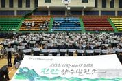 시민행정신문 강갑수 기자 | 진안군이 26일 오후 진안문예체육회관에서 군민 500여 명과 주요 내빈이 참석한 가운데 ‘진안양수발전소 유치 성공기원 범군민 결의대회’를 성황리에 마무리하고, 유치 성공에 대한 강력한 의지를 대내외에 선포했다. 이날 결의대회에는 전춘성 진안군수를 비롯해 김관영 전북특별자치도지사, 안호영 국회의원, 동창옥 진안군의회 의장, 그리고 한국동서발전 권명호 사장 등이 참석하여 진안의 도약에 힘을 실었다. 먼저 성공기원공연으로 준비된 붓글씨 공연(캘리그라피)에서는 ‘새로운 시작, 100년 미래 진안양수발전소’라는 문구를 역동적인 붓놀림으로 그리며 진안의 강력한 의지를 예술적으로 승화시켜 참석자들의 큰 박수를 받았다. 이어 진행된 구동수 위원장과 신갑수 위원장의 결의문 낭독 직후 두 위원장의 선창에 맞춰 500여 군민이 하나 된 목소리로 일제히 손 피켓 펼치기 퍼포먼스가 진행돼 군민의 하나 된 힘으로 양수발전소를 진안에 유치하겠다는 결의를 다졌다. 특히, 마지막 유치 성공 다짐 퍼포먼스는 참석자들의 마음을 하나로 모았다. 군민과 주요 내빈들이 행사 시작 전 대형애드벌룬에