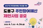 시민행정신문 강갑수 기자 | 서울 도봉구가 2027년 예산편성을 위한 주민참여예산 제안사업을 공모한다. ‘주민참여예산제도’는 주민이 사업을 직접 제안·심사하고 예산편성 과정에 참여함으로써 구 예산의 투명성과 민주성을 높이는 제도다. 공모 분야는 주민의 복리 증진 및 주민 생활에 밀접한 사업 중 주민이 필요하다고 생각하는 사업이다. 사업별 제안 규모는 5천만 원 이하이며, 공연‧축제 등 행사성 사업이나 특정인, 특정 단체를 지원하는 사업 등은 제외된다. 도봉구민이면 누구나 신청할 수 있으며, 신청은 4월 24일까지 도봉구 주민참여예산 누리집으로 하면 된다. 신청서를 작성해 도봉구청 기획예산과 또는 동 주민센터로 방문 제출해도 된다. 접수된 제안은 사업부서의 타당성 검토를 거친 후, 주민참여예산위원회 심사, 주민 모바일 투표를 거쳐 2027년 주민참여예산사업으로 최종 선정된다. 선정된 사업은 하반기 예산편성 과정 이후 내년도에 소관부서에서 사업을 추진한다. 현재 구는 지난해 공모 절차를 통해 선정한 30개 사업을 추진 중이다. 선정 사업으로는 ▲보도를 막는 통신주 이전 ▲쌍문근