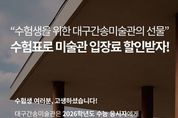 시민행정신문 기자 | 대구간송미술관이 14일부터 26학년도 수능 수험생을 대상으로 다양한 혜택을 제공한다. 수험표를 지참한 수험생에게는 미술관 입장료 최대 30% 할인 혜택(동반 1인 포함)이 제공되며, 이벤트 참여 시 다양한 기념품도 증정된다. 이와 함께 방송인 서경석, 영화감독 이준익이 참여하는 ‘간송예술강좌’를 개최하여 전시에 대한 다양한 의미를 되돌아보는 특별한 시간을 가진다. 수험생 대상 입장료 30% 할인(동반 1인 포함) 및 참여형 이벤트 진행, 11월 14일부터 수험생 입장료 30% 할인은 수능 다음날인 11월 14일부터 12월 31일까지 진행된다. 현재 미술관에서 전시 중인 광복 80주년 기념 기획전 《삼청도도 – 매·죽·난, 멈추지 않는 이야기》와 상설전 모두 할인 혜택을 받을 수 있다. 수험생 우대를 받기 위해서는 수능 수험표, 수시 합격증 등 수험생임을 증명할 수 있는 증빙서류를 매표소에 제시하면 된다. 이와 함께 미술관은 다양한 참여 이벤트를 마련했다. 연말까지 수험생 우대를 받고 입장한 선착순 250명에게 간송 대표 소장품이 담긴 컬러링 북을 선물한다. 더불어 대구간송미술관 카카오톡