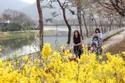 시민행정신문 강갑수 기자 | 충북 괴산군 괴산읍 동진천변 산책로에 봄꽃이 피어 나들이객들의 발길이 이어지고 있다. 개나리 뒤편 산책로를 따라 연분홍빛 벚꽃도 꽃망울을 터트리기 시작해 봄 정취를 더한다. 전경에 가득 찬 개나리 물결 사이로 가족 단위 나들이객들이 산책을 즐기고 있다. 동진천은 화사한 봄꽃에 이어 음악분수, 미디어파사드, 괴산오작교를 비롯한 수변 공간을 두루 갖춰 주야간 내내 주민과 방문객에게 사랑을 받고 있다.