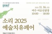 시민행정신문 강갑수 기자 | 여수시는 오는 11월 16일 이순신광장에서 ‘소리 2025 예술치유페어’를 개최한다. 이번 행사는 ‘소리를 느끼고, 마음을 치유하다’를 주제로 음악·악기·미술 등 다양한 감각 기반 콘텐츠를 시민이 직접 체험하며 예술적 치유를 경험할 수 있도록 마련됐다. 단순 전시 중심의 행사에서 벗어나 공연·체험·전시를 결합해 도심의 문화적 활력과 시민 정서 회복에 기여할 수 있도록 기획됐다. 특히 지역 예술기업, 공예·악기팀 등 다양한 업체가 참여해 지역 기반의 예술 치유 네트워크를 형성하고 마이스 특화전시 사업의 취지인 지역 산업 및 예술기업과의 연계를 강화하는 계기가 될 전망이다. 행사장 내 ‘소리놀이터’에는 무대와 포토존이 운영되며 시간대별 프로그램이 진행된다. 오전 오프닝 체험을 시작으로 국악과 힐링 악기가 함께하는 특별 무대가 펼쳐지며 시민이 직접 악기를 시연해보는 관객 참여형 콘텐츠도 마련된다. 김상욱 여수시 관광과장은 “이번 ‘소리 2025 예술치유페어’는 시민의 심리적 안정과 문화 향유 기회 확대는 물론 여수 마이스 특화전시사업의 방향인 지역 예술 콘텐츠 육
