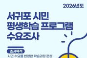 시민행정신문 강갑수 기자 | 서귀포시는 시민 의견을 바탕으로 2026년도 평생학습 프로그램 편성을 준비하고 분야별 강사를 공개모집하기 위해 온라인 수요조사를 진행한다. 이번 조사는 만 19세 이상 서귀포 시민을 대상으로 9월 15일부터 9월 30일까지 진행되며, 네이버 폼을 통해 간편하게 참여할 수 있다. 서귀포시는 시민 누구나 부담 없이 설문에 참여할 수 있도록 문항을 성별·연령·거주지 등 응답자 정보, 평생학습 참여 경험, 선호 시간대, 원하는 프로그램 유형 등 12개로 간결하게 설계했다. 수집된 결과는 2026년 서귀포시 평생학습관 프로그램 편성과 강사 공모, 읍면동 평생학습센터 운영 등 지역별 평생학습 지원 정책 마련에 활용될 예정이다. 특히 지역에서 활동하는 전문가들의 강사 활동 참여 기회를 확대하고 교육 내용의 다양성과 질을 높이기 위한 강사풀 공개모집의 분야별 인원 배정에도 직접 반영된다. 강사풀 공개모집은 10월 말 예정이며, 세부 내용은 추후 공고될 예정이다. 서귀포시 관계자는 “이번 설문조사 결과를 적극 반영하여 시민의 다양한 요구에 맞춘 평생학습 기회를 제공하겠다”라