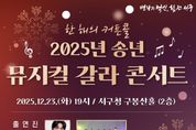 시민행정신문 강갑수 기자 | 대전 서구가 한 해를 마무리하고 새해를 맞는 무대를 선사한다. 서구는 오는 12월 23일 구청 2층 구봉산홀에서 ‘2025년 송년 뮤지컬 갈라 콘서트’를 개최한다고 10일 전했다. 공연은 90분간 진행되며 뮤지컬 배우 이건명과 라움앙상블이 출연한다. ‘맘마미아’ 메들리와 ‘영웅’ 등 대중적 인지도가 높은 작품을 비롯해, 캐롤 메들리 등 연말 분위기를 담은 무대가 선보인다. 이달 22일까지 서구청 홈페이지의 [구민참여] 게시판 [통합예약시스템]에서 예약받는다. 추가적인 사항은 서구 문화체육과로 문의하면 된다. 서구 관계자는 “올 한 해 구민 여러분이 서구에 보내주신 사랑과 관심에 감사드린다”며 “앞으로도 구민들의 문화 향유 기회 확대를 위해 지속적으로 노력하겠다 ”고 전했다.