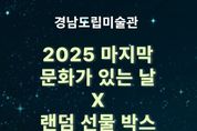 시민행정신문 기자 | 경남도립미술관은 12월 31일 ‘문화가 있는 날’을 맞이해 연말을 함께 즐길 수 있는 특별 이벤트를 마련한다고 밝혔다. 이날 미술관은 전시실을 무료 개방하며, 관람 시간 또한 오후 8시까지 연장 운영된다. 오후 6시부터는 미술관을 찾은 관람객 중 선착순 30명에게 참여 기회가 주어지는 ‘행운권 추첨 이벤트’가 진행되며, 참여자에게는 랜덤 선물 박스 등 다양한 경품이 증정된다. 이번 행사는 ‘문화가 있는 날’을 통해 관람객이 미술관을 보다 가깝게 느끼고, 한 해를 예술과 함께 마무리할 수 있도록 기획됐다. 미술관 관계자는 “2025년을 함께 해준 지역민들에게 감사의 마음을 전하며, 작은 선물과 예술의 경험이 따뜻한 연말 추억이 되길 바란다”라고 전했다. 한편, 이번 야간 개장에서는 현재 진행 중인 환경을 주제로 한 체험형 전시《테라폴리스를 찾아서》와 함께《현대옻칠예술: 겹겹의 시간》도 관람가능하다.