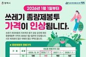시민행정신문 강갑수 기자 | 평택시는 2026년 1월 1일부터 쓰레기 종량제 봉투 가격을 3개년도에 걸쳐 인상한다. 그동안 평택시는 인구증가, 물가상승, 생활 쓰레기 수집 운반 처리비용 증가에도 불구하고 2006년 이후 종량제봉투 가격을 동결해 왔다. 시 관계자는 “현재 평택시의 종량제 가격은 경기도 31개 시군 가운데 최하위 수준이며, 청소예산 재정자립도와 주민부담률이 낮아 가격 인상은 불가피하다”고 밝혔다. 따라서, 대표적으로 일반용 종량제봉투 20리터는 현재 500원에서 110원 인상된 610원으로, 음식물 전용 봉투 1.5리터는 현재 40원에서 20원이 인상된 60원으로, 공동주택에 설치된 음식물종량제기기(RFID)는 1㎏ 단위로 현재 48원에서 12원 인상된 60원으로, 경기도 내 31개 시군 평균 가격을 반영하여 인상안을 마련했다. 다만, 서민경제의 어려움과 시민부담을 고려하여 가격 인상은 3개년도에 걸쳐 단계적으로 시행할 예정으로, 시 관계자는 “종량제봉투 가격 인상에 대한 시민 여러분의 많은 이해와 협조를 부탁드린다”며 “앞으로도 쾌적하고 청결한 도시환경 조성은 물론 질 높은 청소행정